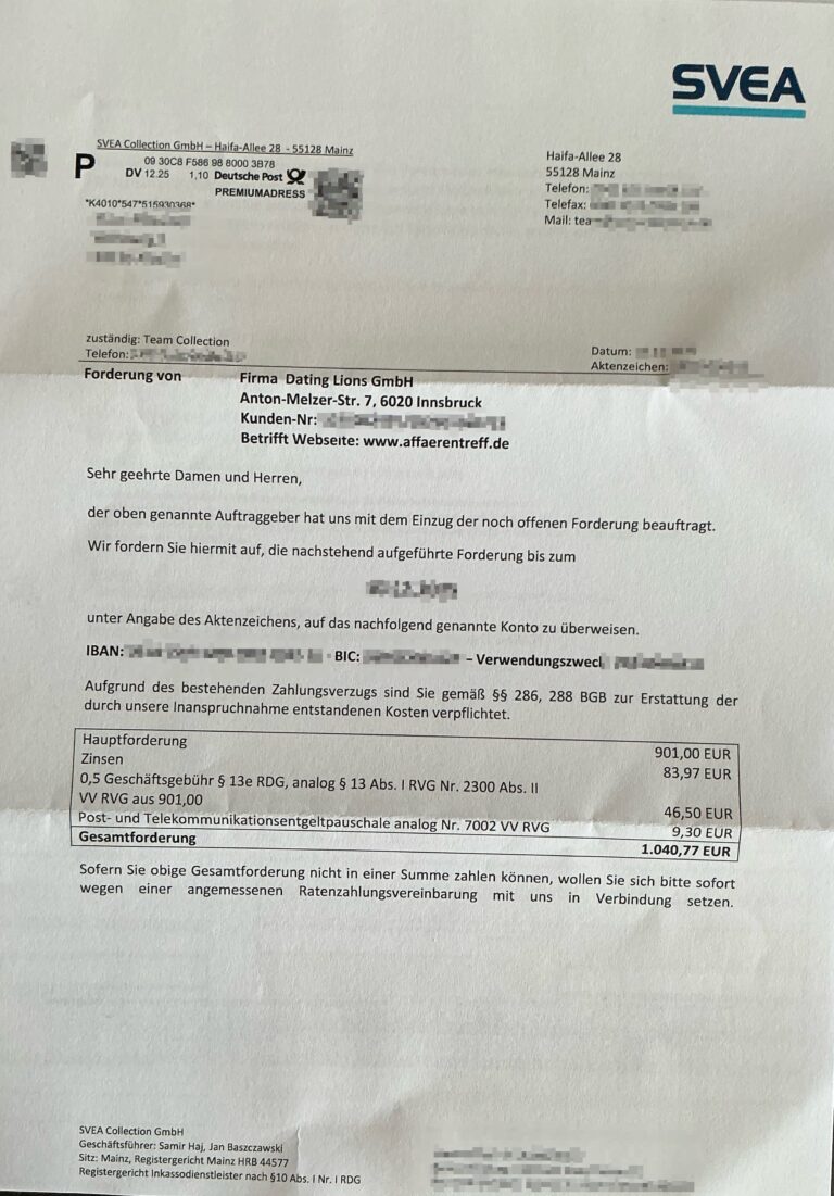 Die SVEA Collection GmbH ist ein Inkassodienstleister mit Sitz in Mainz. Das Unternehmen macht insbesondere Forderungen für die Dating Lions GmbH geltend. Diese betreibt verschiedene Datingportale im Internet, darunter z. B. www.affaerentreff.de.